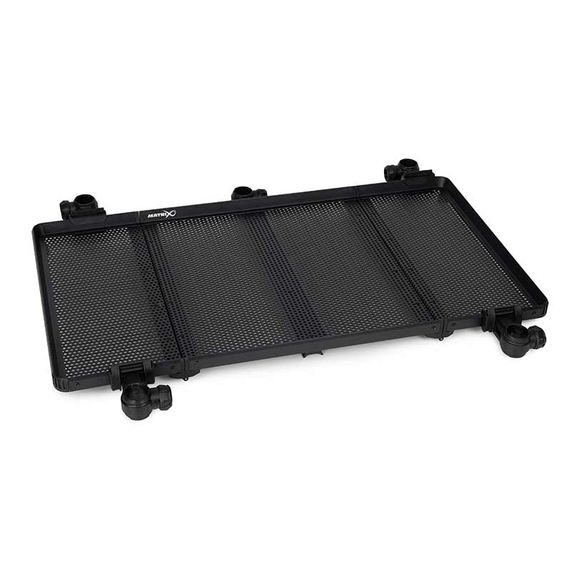 Matrix Folding Side Tray LARGE, deze grotere zijtafel is perfect als tray en kan eenvoudig naast de poten van je seatbox worden gepositioneerd, waar door je aas, lokvoer en accessoires altijd binnen handbereik hebt zonder dat je werkruimte rommelig wordt. Het geperforeerde oppervlak zorgt voor een efficiënte afvoer van regenwater en overtollig voer, zodat je werkplek altijd schoon en droog blijft. Door het slimme inklapbare ontwerp van deze tray is deze uiterst gebruiksvriendelijk ook voor transport, want hij vouwt eenvoudig samen van 90.5 naar 47 cm breedte, zodat hij weinig ruimte inneemt in je uitrusting. De tray is vervaardigd uit extra sterk en duurzaam materiaal dat bestand is tegen intensief gebruik aan de waterkant.